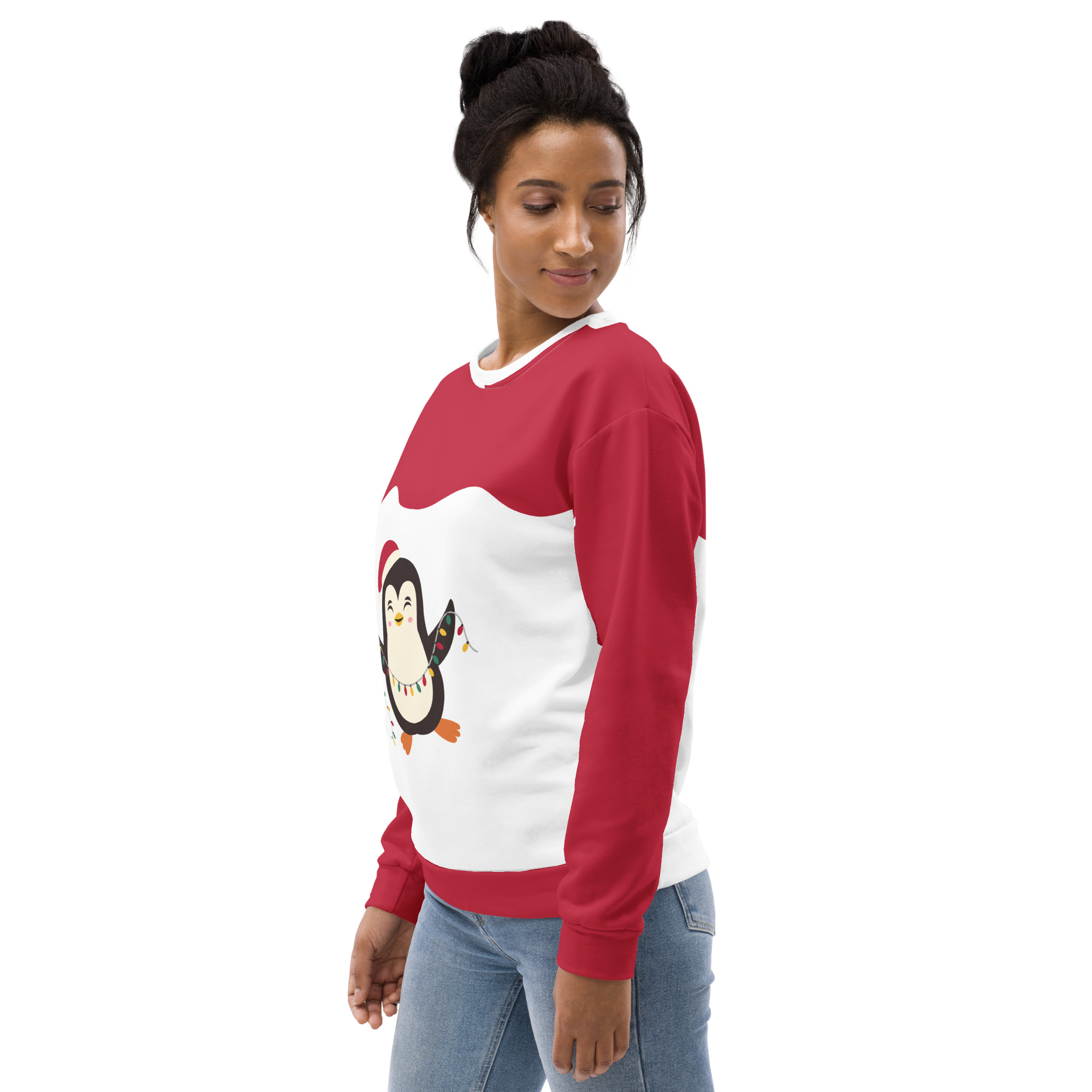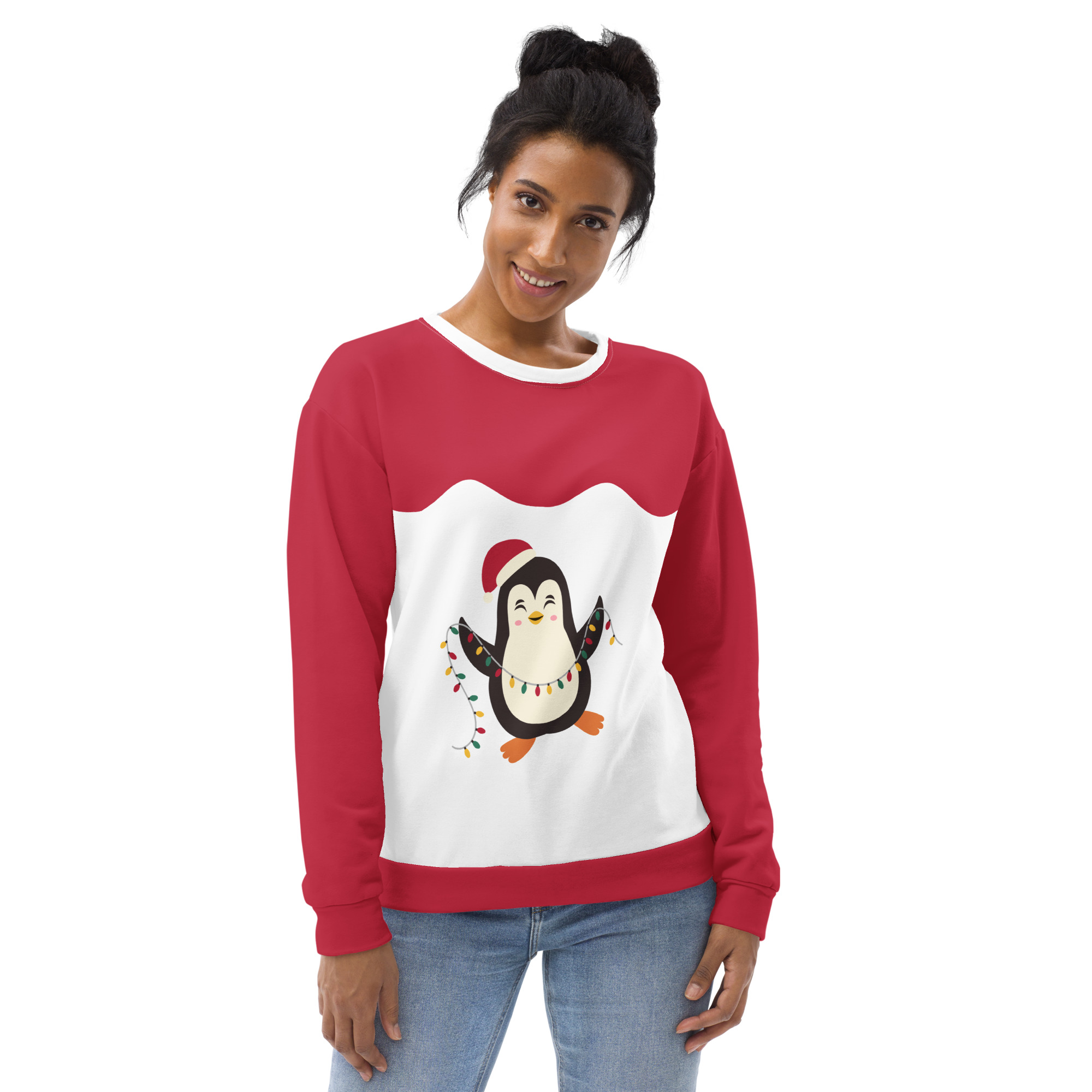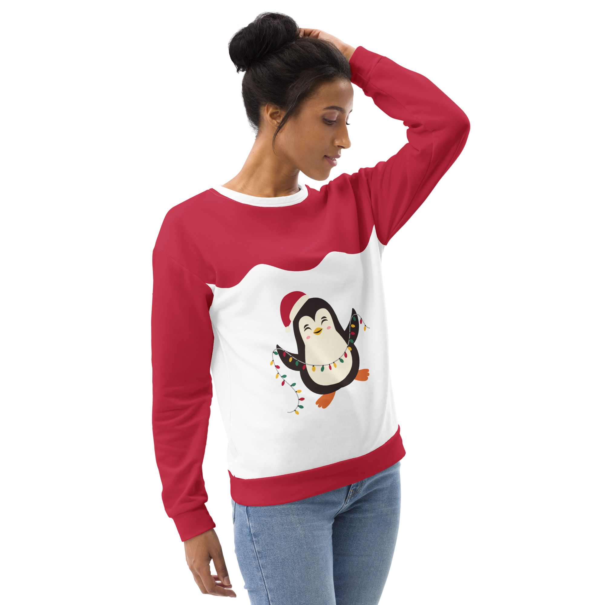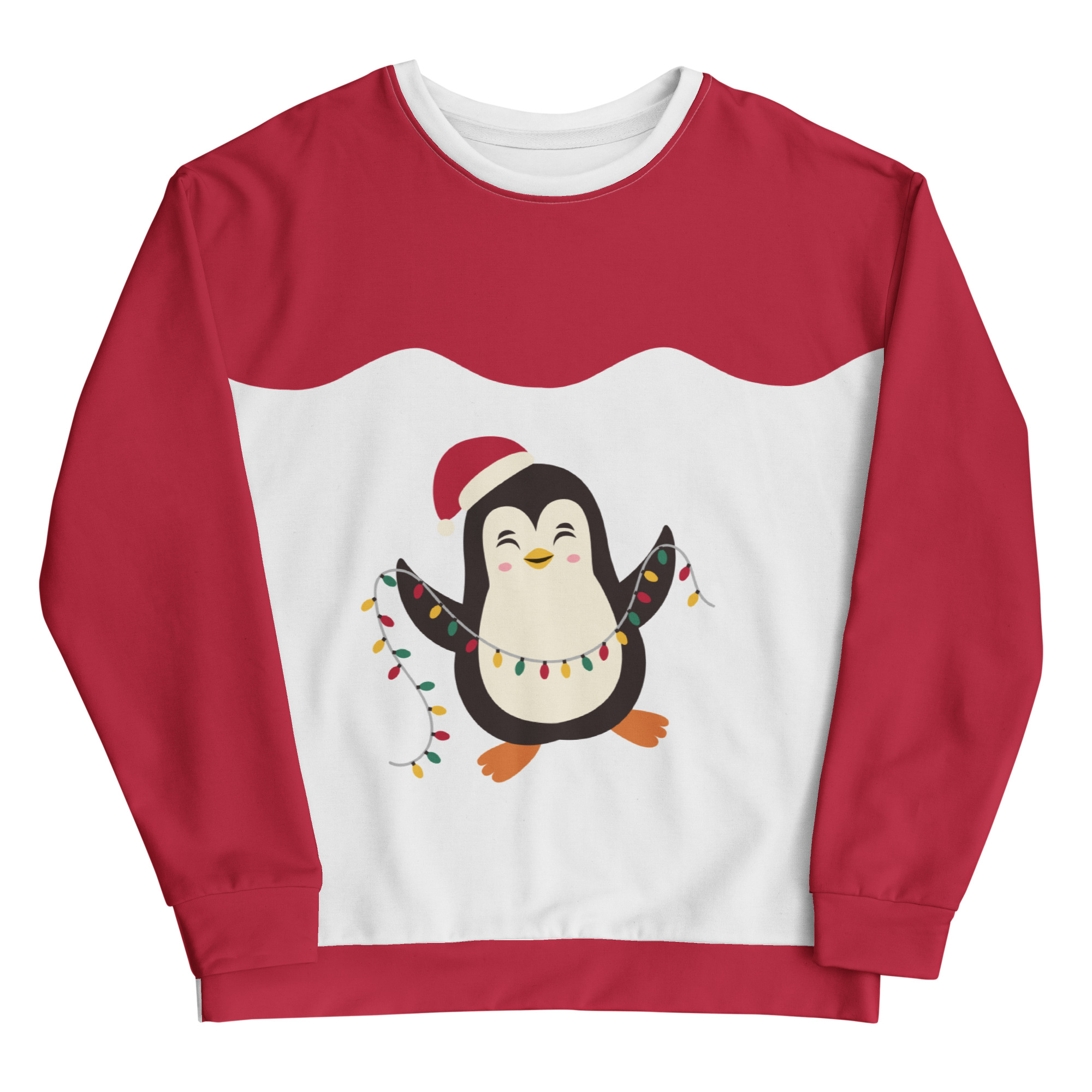 This cheerful knit features a holiday-ready penguin tangled in twinkling Christmas lights, topped with a Santa hat and wrapped in charm. The bold red sleeves and snowy white center make this sweater pop in every photo and party gathering.