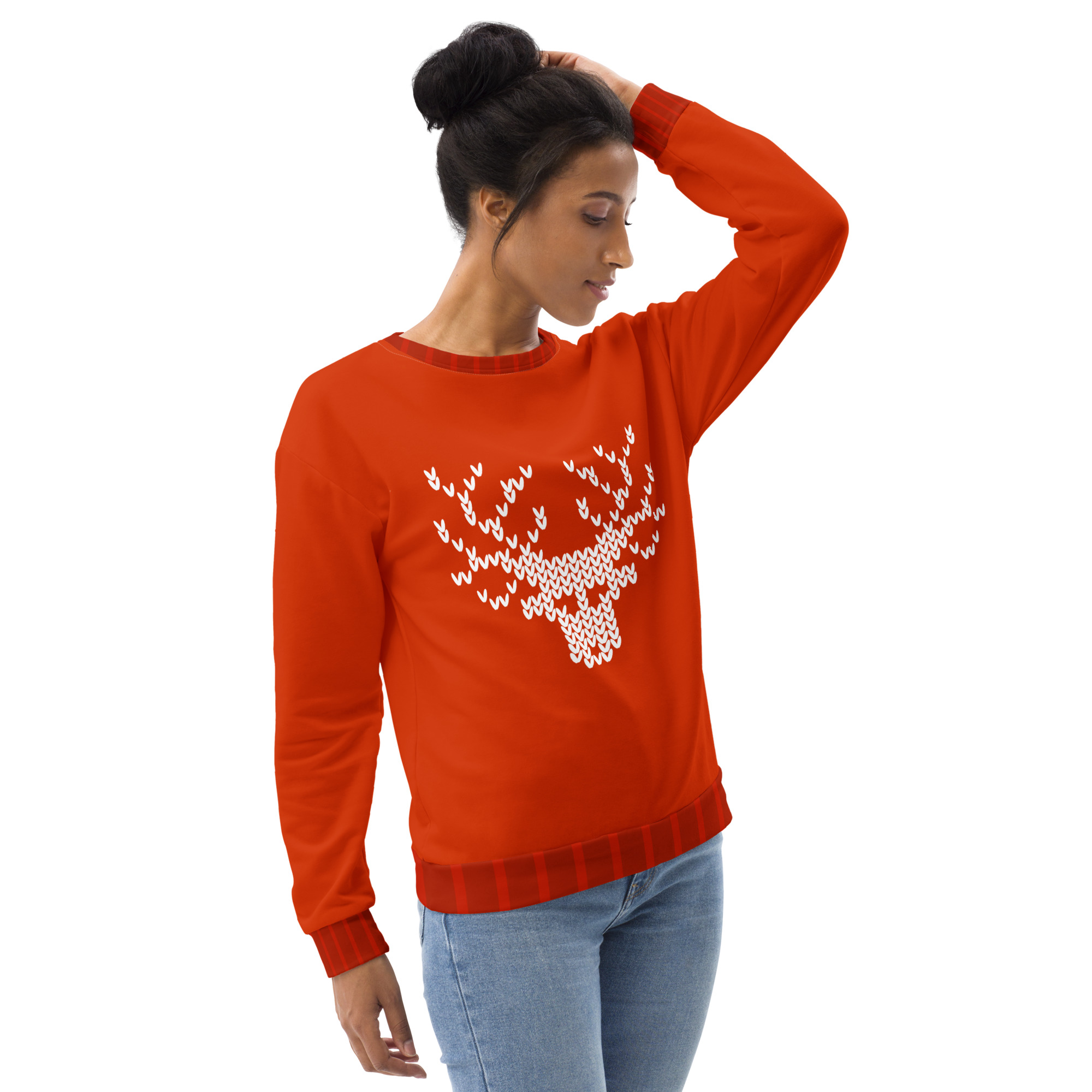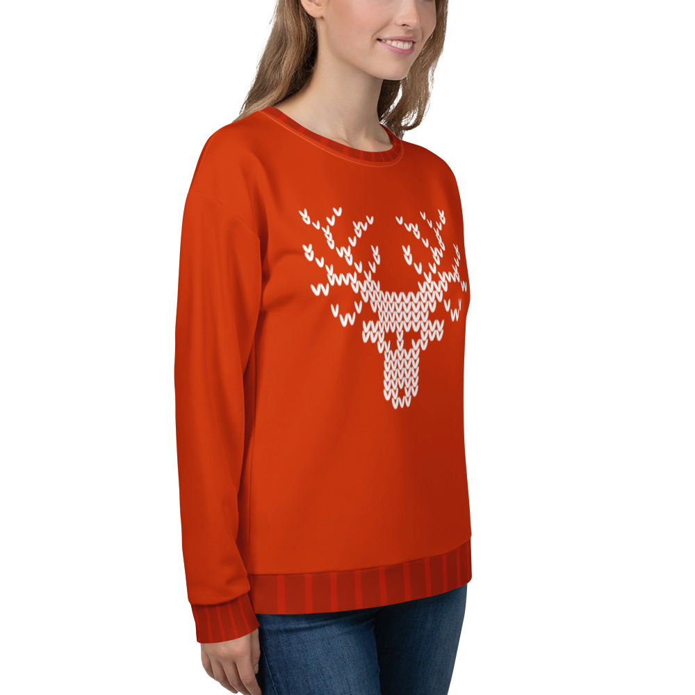 Set in a classic red hue with a white pixel-style reindeer graphic, this sweater combines nostalgic charm with bold seasonal flair. Whether you’re hosting a holiday party or striking a pose under the mistletoe, this cozy knit guarantees smiles and standout style.
